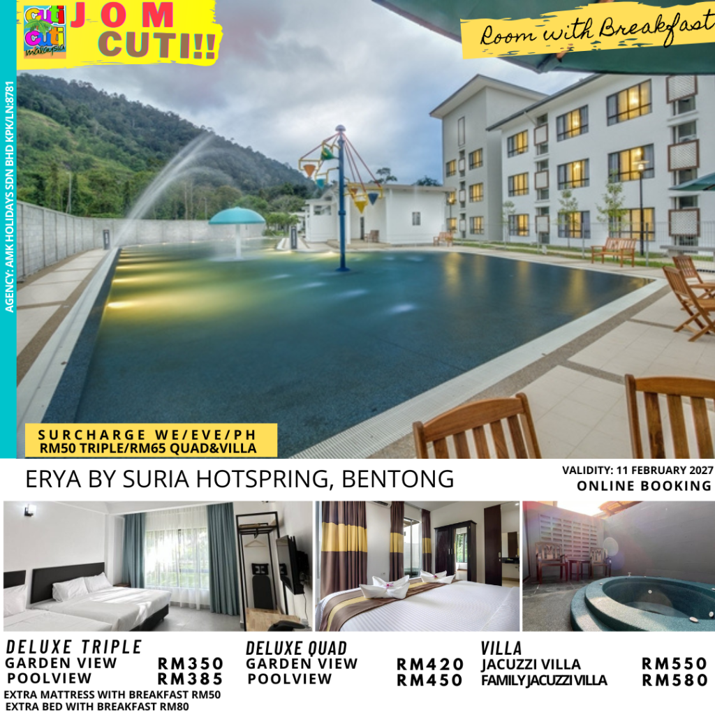 ēRYAbySURIA Resort Hot Spring Bentong in Pahang is located about 69 kilometres or an hour’s drive away from Malaysia’s capital, Kuala Lumpur. Situated in the surroundings of an invigorating rainforest, the resort offers a hot spring pool to float and soak in rusty, mineral-rich water, warmed to the perfect temperature with fresh, hot water channelled directly from the hot springs.