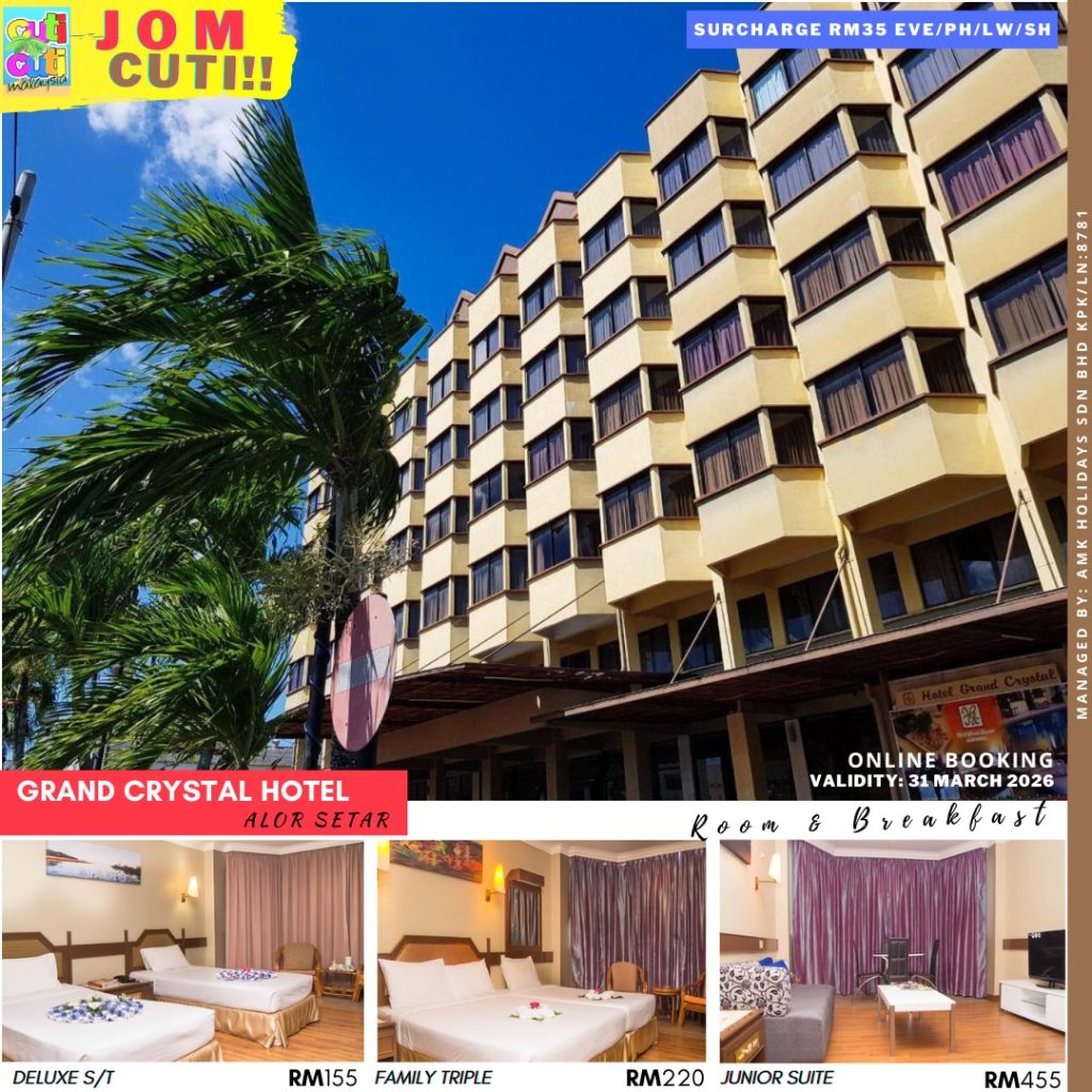 Hotel Grand Crystal Alor Setar was managed and operated by HOTEL GRAND CRYSTAL (AS0169045-U). A warm welcome back to the Nostalgic 80s and experience the warm touch of Hotel Grand Crystal Kedah. The hotel features a relaxing outdoor pool and the Putra Coffee House with Room Service that serves a variety of Malaysian delicacies and continental dishes. Our rooms are well equipped with air conditioning, satellite TV, private bathrooms that comes with a bathtub/shower and hairdryer, a mini fridge and coffee/tea facilities. Guests who drive can enjoy free parking at Grand Crystal. Hotel Grand Crystal is also a transit point for those needing an overnight rest while in transit to a Thai adventure. It’s only a 45-minute drive from shopping options at Duty Free Complex at Bukit Kayu Hitam at the border and Danok Town in Thailand.
