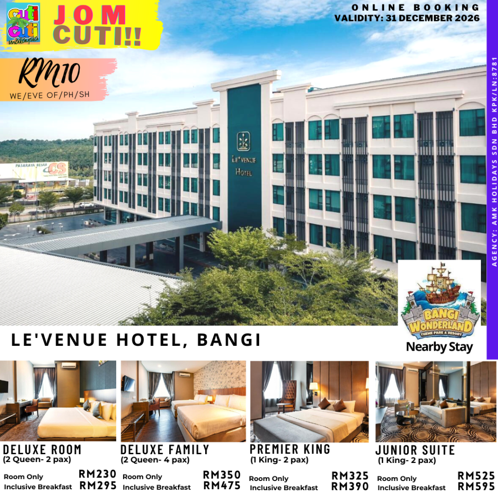 Le’venue Hotel conveniently located midway between Kuala Lumpur International Airport and Kuala Lumpur city centre.The hotel is surrounded by a largest south convention centre (Bangi Avenue Convention Centre) and adjacent within 200 meters from Bangi Wonderland Water Park provides a unique accommodation to our guests.