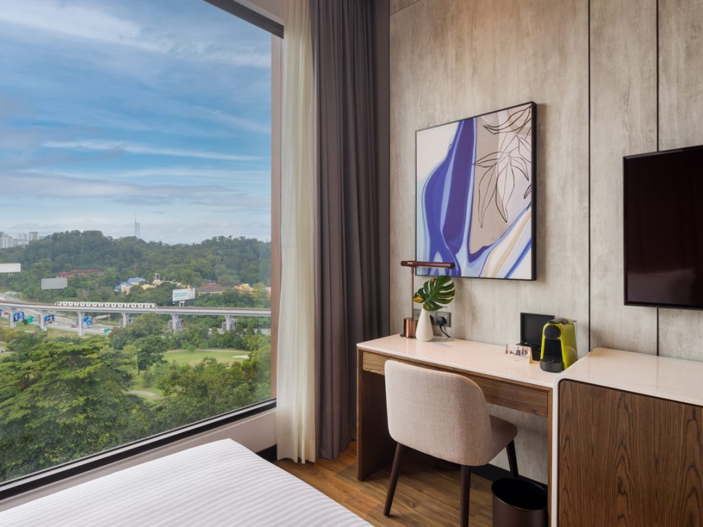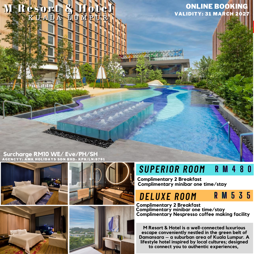 M Resort & Hotel is a well-connected luxurious escape conveniently nestled in the green belt of Damansara โ a suburban area of Kuala Lumpur. A lifestyle hotel inspired by local cultures; designed to connect you to authentic experiences, this picturesque hotel offers unique views of one of the cityโs renowned green areas โ the Kelab Golf Perkhidmatan Awam (KGPA) and seamlessly combine value with comfort, personalised intuitive service, exquisite accommodations, culinary excellence as well as spectacular spas for urban elites and business travellers.