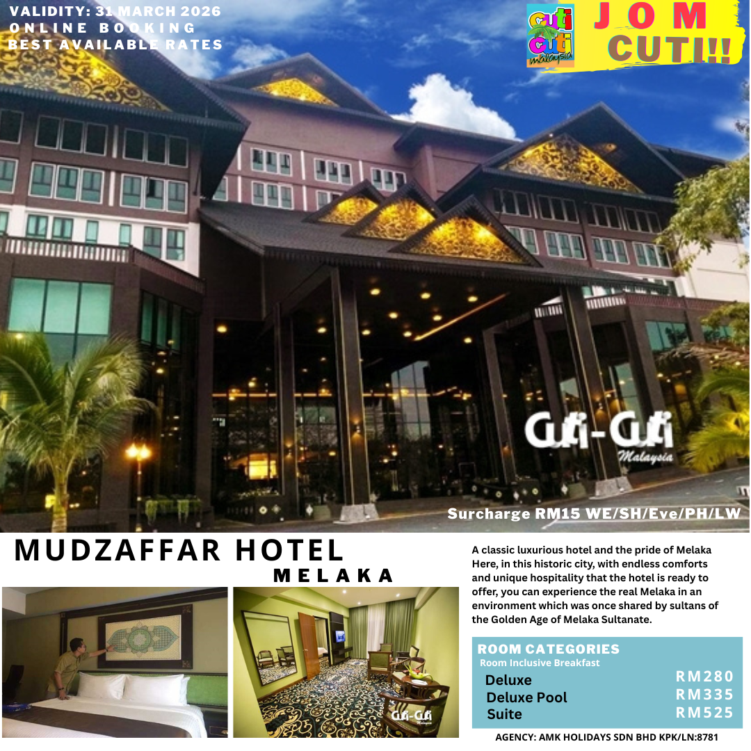 In line with the name of Sultan Mudzaffar Shah the Sultan of Melaka credited for bringing the Melaka empire to its Golden Age, The Mudzaffar Hotel offer guests an extraordinary place that is created by combining exceptional architecture and structure, expressive decor and artistry, and magnificent features all under one roof. Add great service to this and the result is an extraordinary experience that would make your memory of The Mudzaffar Hotel a long and lasting one.