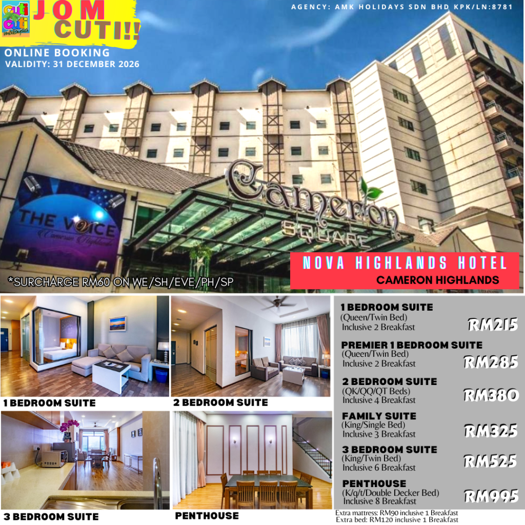 Nova Highlands Resort & Residence is a family hotel at Aranda Nova in Kea Farm, about 3km away from Brinchang town along the main road to Tringkap. This recent integrated hotel and residential development also features Cameron Square – the only shopping mall in Cameron Highlands that houses a good collection of shops, boutiques, cafes and restaurants.