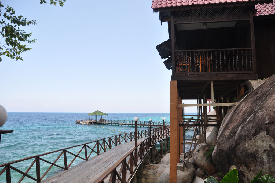 Almost the entire resort lies stretched across a steep hill that feeds into the bay, while villas and chalets tower almost precariously on stilts. The resort has an abundance of accommodation, ranging from basic fan rooms to more opulent units, each with a private balcony that opens out to a fantastic view of the island and sea.