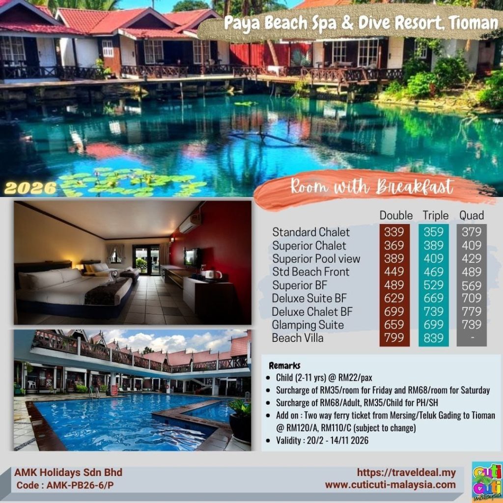 Paya Beach Spa & Dive Resort is a 4-Star beachfront resort centrally located at the central western shores of Tioman Island, Malaysia. Stay with us to experience the white sand beach that spans across our beachfront Tioman Resort. Enjoy the breathtaking views, turquoise water and spectacular house coral reefs with your loved ones.