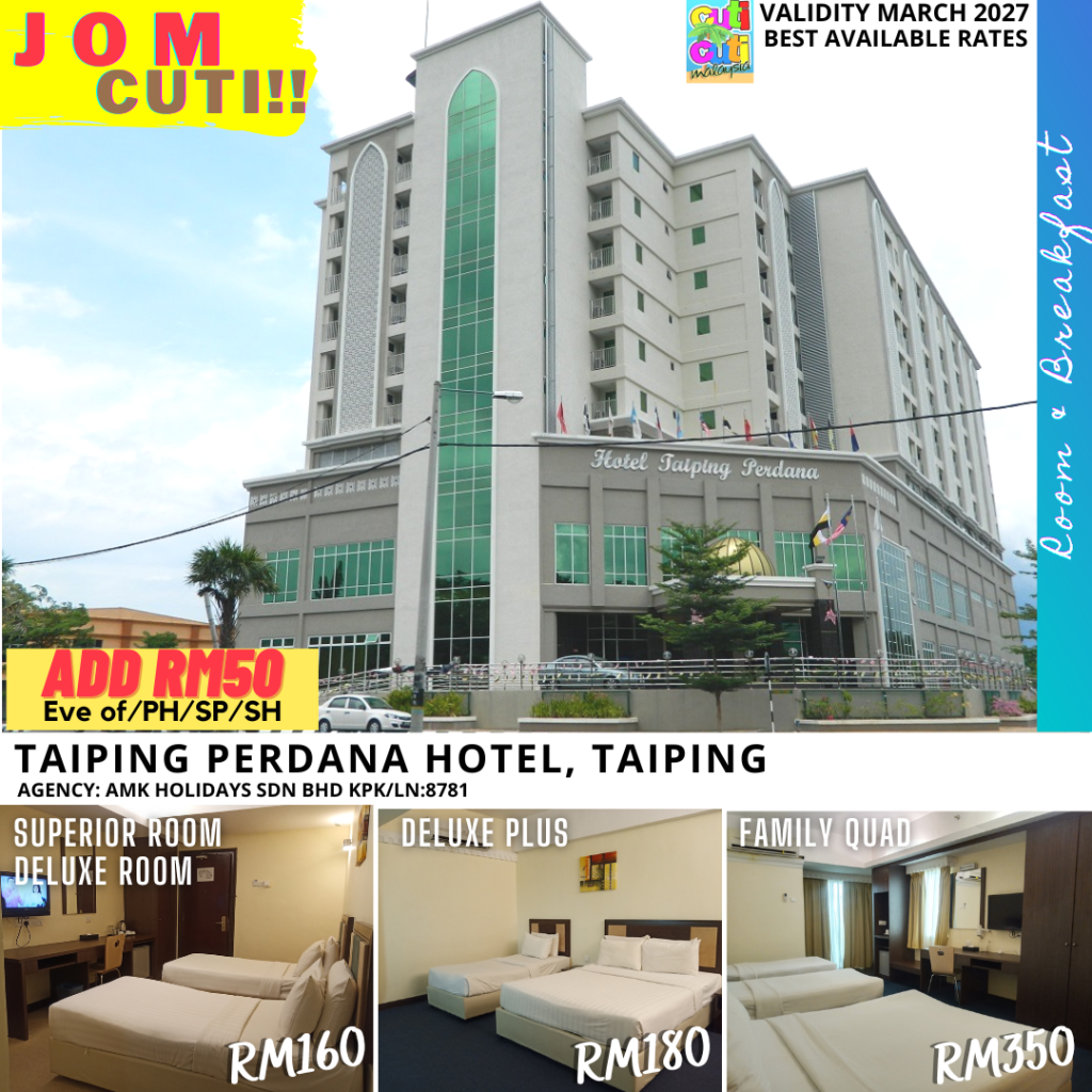 Hotel Taiping Perdana offers a three star rating hotel with four star facilities and services. Located in the heart of the Taiping Town’s major commercial, financial, shopping and entertainment district, the Hotel is within short driving distance of the local town’s multinational companies, banks and financial institutions.