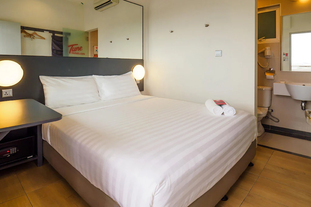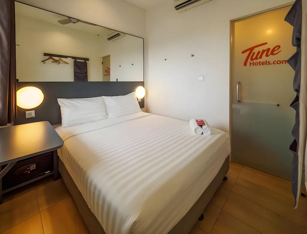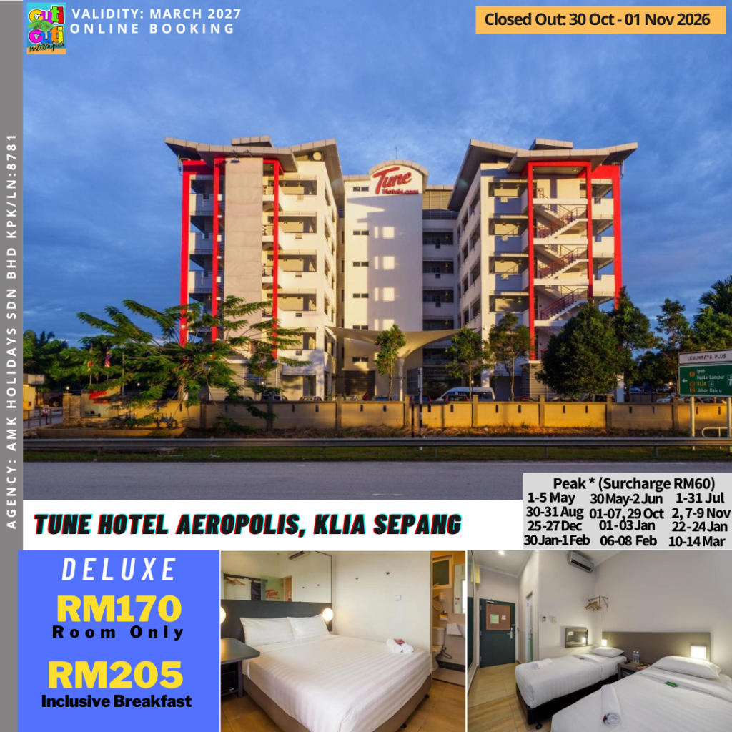 Tune Hotel Aeropolis is a budget‑friendly property located just a 15‑minute drive from both KLIA Terminals 1 and 2 and the Mitsui Outlet Park KLIA Sepang, with the Sepang International Circuit only 3.7 km away. Guests may check in any time from 2:00 pm until 2:00 am and must check out by 11:00 am. The hotel provides a complimentary 24‑hour shuttle service to and from Tune Hotel KLIA‑KLIA2, departing every two hours starting at midnight (pre‑booking required at the front desk). On‑site dining at MAKAN restaurant serves authentic Malaysian dishes from 6:00 am to 10:30 pm, and a 24‑hour front desk ensures staff are always available to assist.