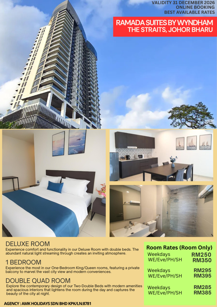 Welcome to the Ramada Suites By Wyndham The Straits Johor Bahru, your 4-star retreat nestled in the heart of Johor Bahru City. With 190 spacious rooms and suites, each offering modern amenities and Complimentary WiFi we aim to provide you with a comfortable stay. Our premier suites feature a kitchenette, living area, and private balconies, offering panoramic views of the Johor Straits and lush greenery.
